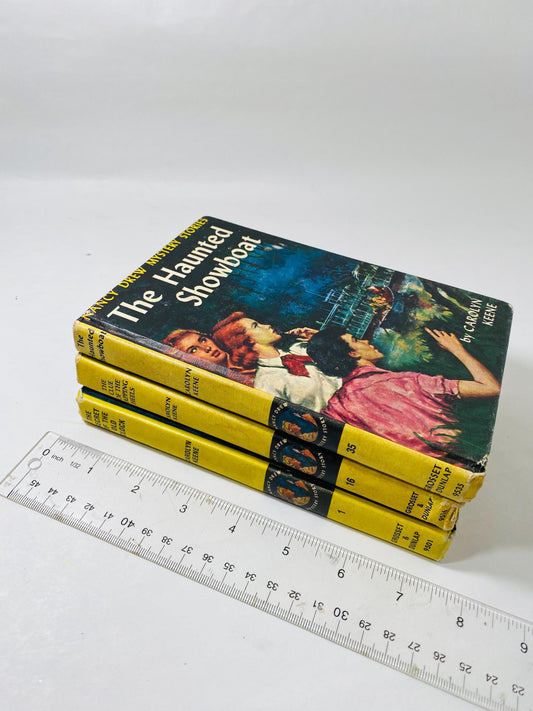 1957 Nancy Drew Mystery Stories Carolyn Keene Haunted Showboat Cue Tapping Heels Secret Old Clock Vintage books black & white endpapers