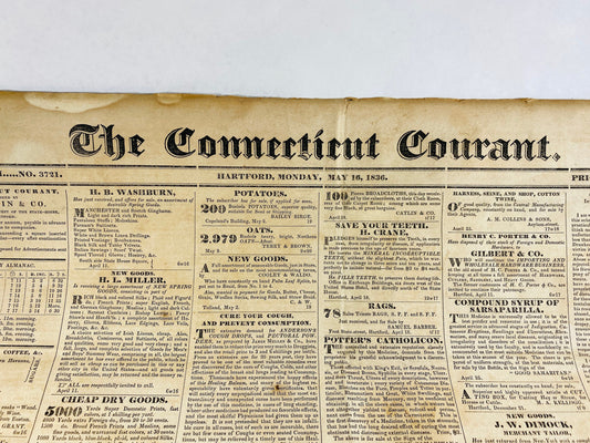 1836 Connecticut Courant Newspaper circa May 16, 1836 GENUINE antique newspaper pre-civil war. Hartford CT Godwin & Co