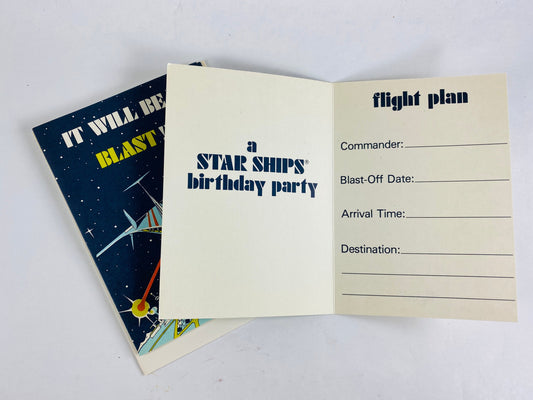 1980s spaceship rocket party invitation cards Lot of 3 unused cards with envelopes. Vintage Flight plan astronaut NASA themed