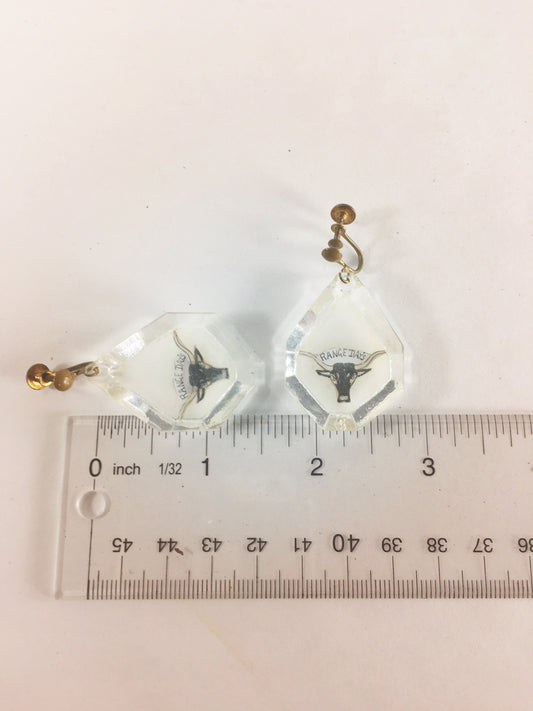 1969 vintage Texas rodeo clip-on earrings and pin lot Houston Range Days Austin Longhorn collectible jewelry. Yellow cowboy hat, teardrop