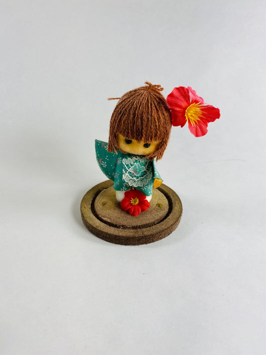 Vintage doll circa 1960s sad eyes felt girl long brown hair and pink orchid attached to round base Fisherman Aesthetic Maritime Living