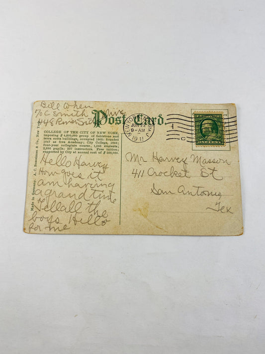 City College NY New York City Vintage postcard circa 1911 with Ben Franklin 1 cent stamp. Perfect for framing! Home office wall decor