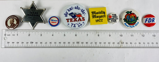 Vintage pinback button New York NYC, Texas Marshal, Alfred Smith Presidential Election, FDR, Nixon World's Fair, Mostly Mozart memorabilia