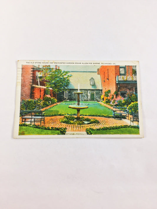 1930s Vintage Edgar Allan Poe shrine of house and enchanted garden linen postcard. Old Stone House in Richmond Virginia