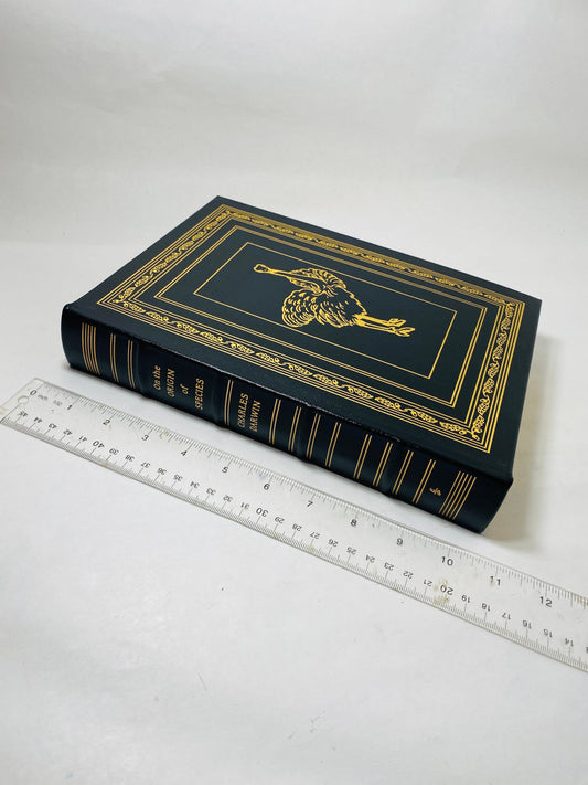 Charles Darwin's Origin of Species Easton Press vintage book Beautiful black and gold leather bookshelf decor Evolution outdoors nature gift