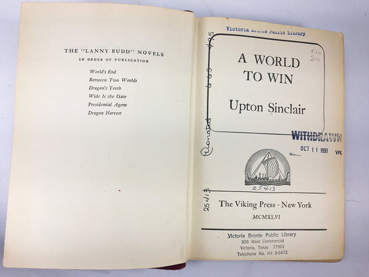 A World to Win by Upton Sinclair. FIRST EDITION vintage book circa 1946. Lanny Budd series. Pulitzer Prize winning author. Red book decor