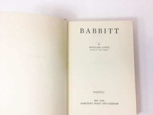 Babbitt vintage book by Sinclair Lewis circa 1950. Grey cloth Satirical novel about middle-class life and social pressure conformity.