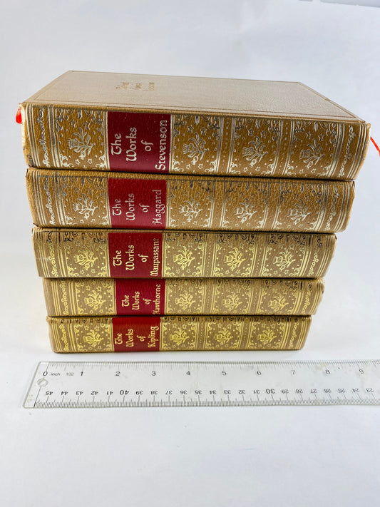 1958 Vintage book Nathaniel Hawthorne Kipling Maupassant Haggard Robert Louis Stevenson gold leaf Beige home decor