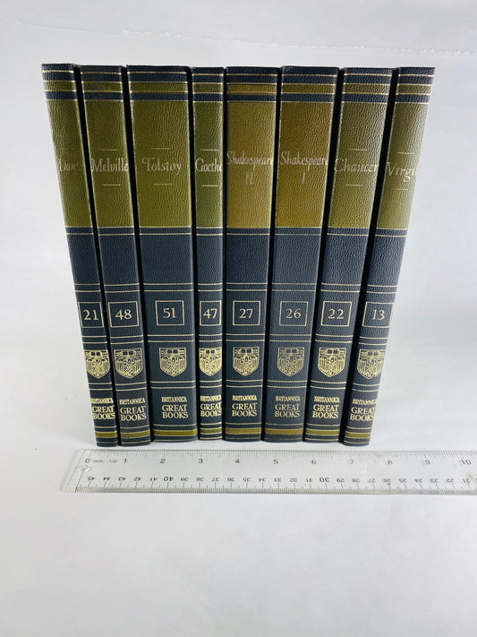 Vintage olive green & black Tolstoy Melville Goethe Shakespeare Chaucer Virgil Dante Britannica Great Books Staging bookshelf decor 1986